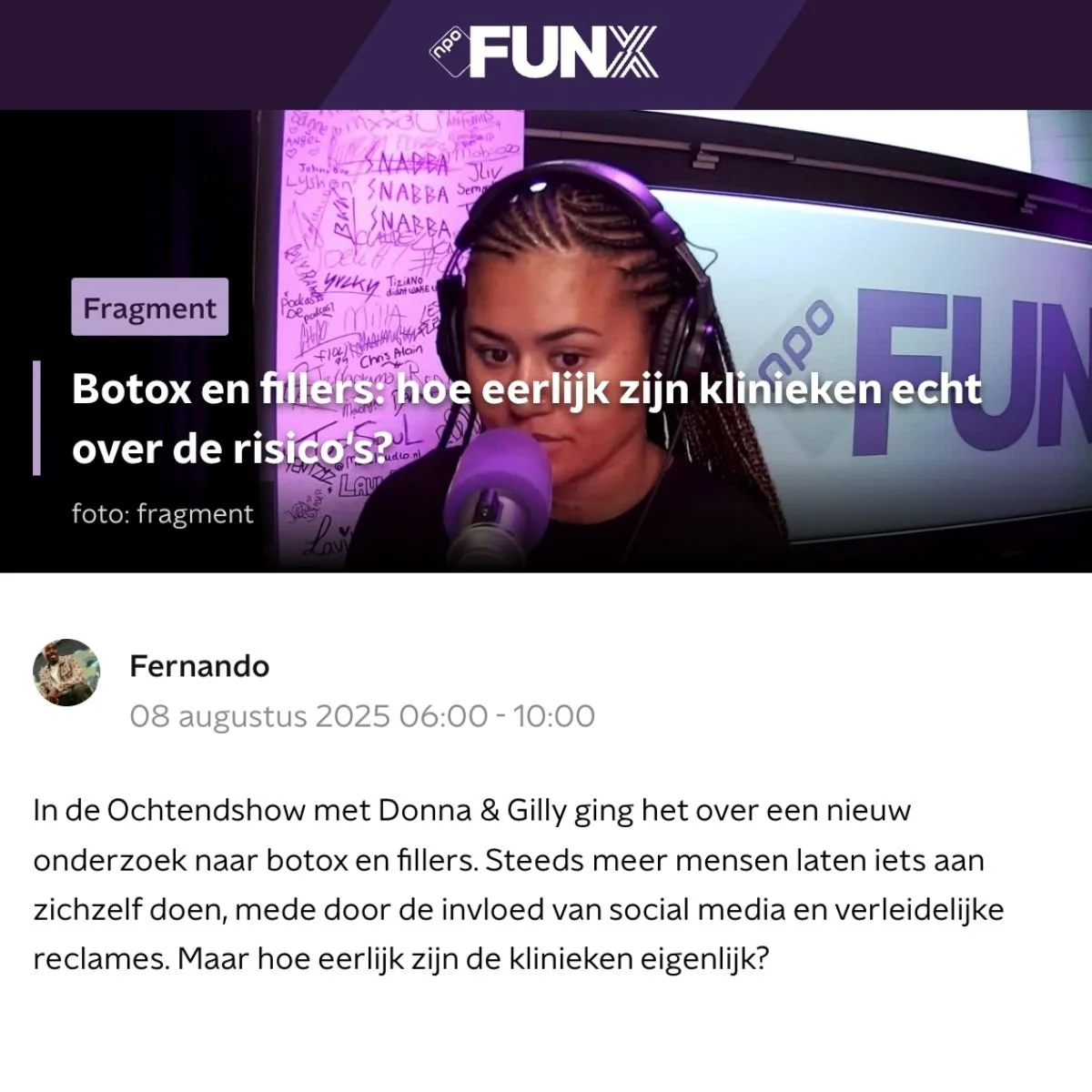 In de ochtendshow met Donna & Gilly vertelt Sietske over het onderzoek naar de wijze waarop cosmetisch klinieken in Nederland communiceren over filler- en botoxbehandelingen. Uit het onderzoek blijkt dat bij de helft van de klinieken cruciale informatie ontbreekt. Risico’s, bijwerkingen en alternatieven worden vaak niet genoemd.